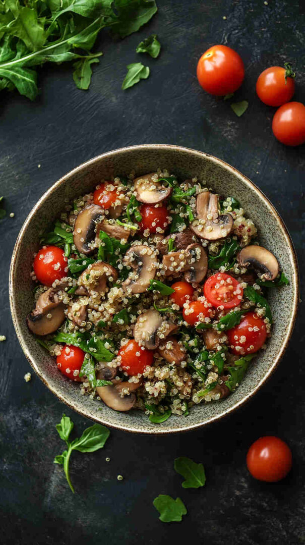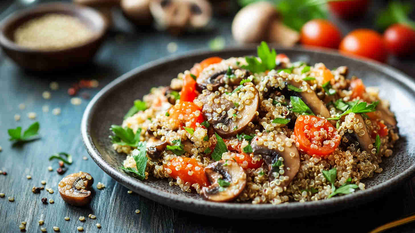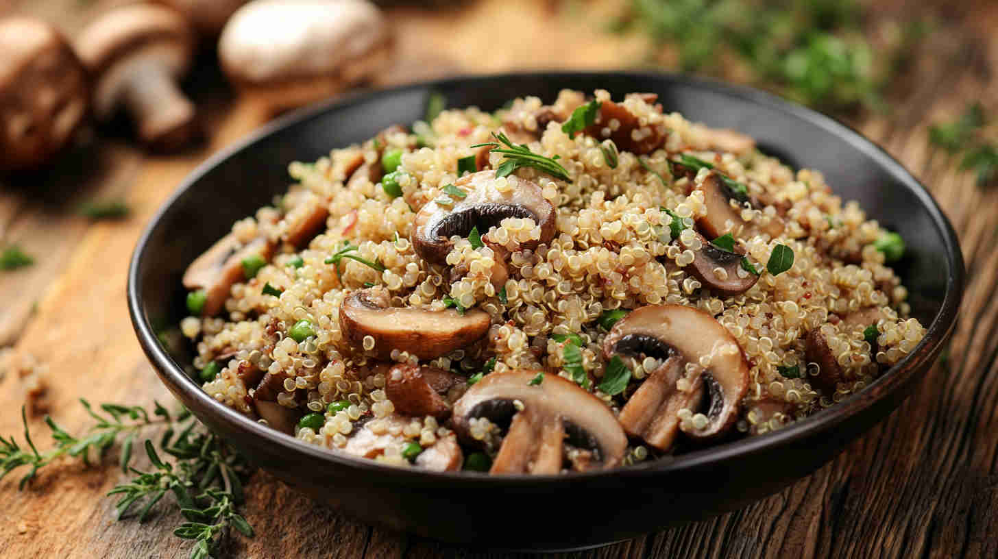 Rinse quinoa thoroughly before cooking to remove its natural bitter coating (saponins). Toast quinoa in a dry pan for 1–2 minutes before boiling for deeper nutty flavour. Let mushrooms brown properly with space in the pan—don’t overcrowd or they’ll steam instead of caramelise.