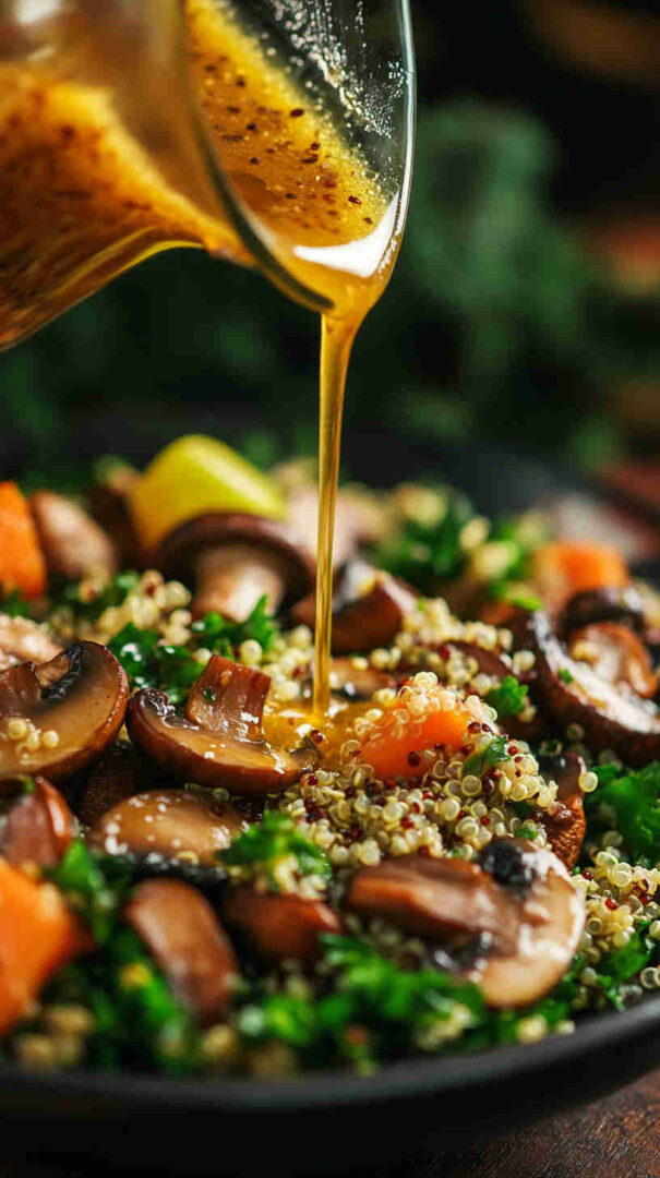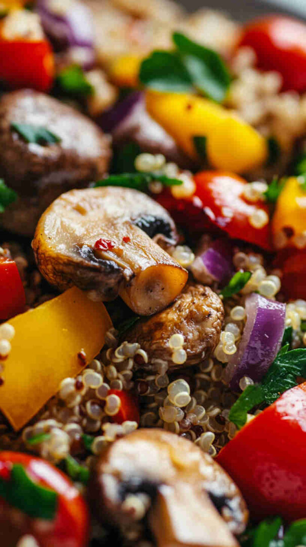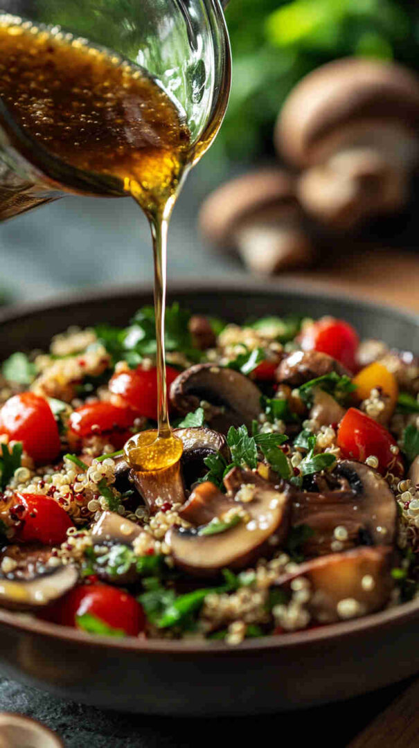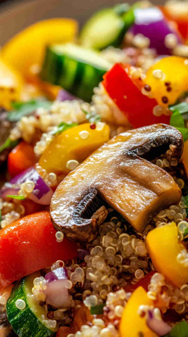 Rinse quinoa well—bitter saponins ruin the flavour. Brown mushrooms properly for best taste. Dressing thickens as it sits—thin with warm water if needed before tossing. Naturally vegan and gluten-free. Perfect for meal prep—keeps texture beautifully for 3–4 days.