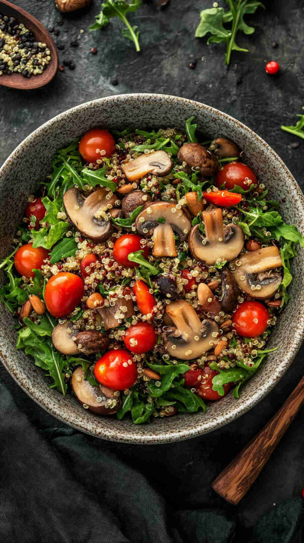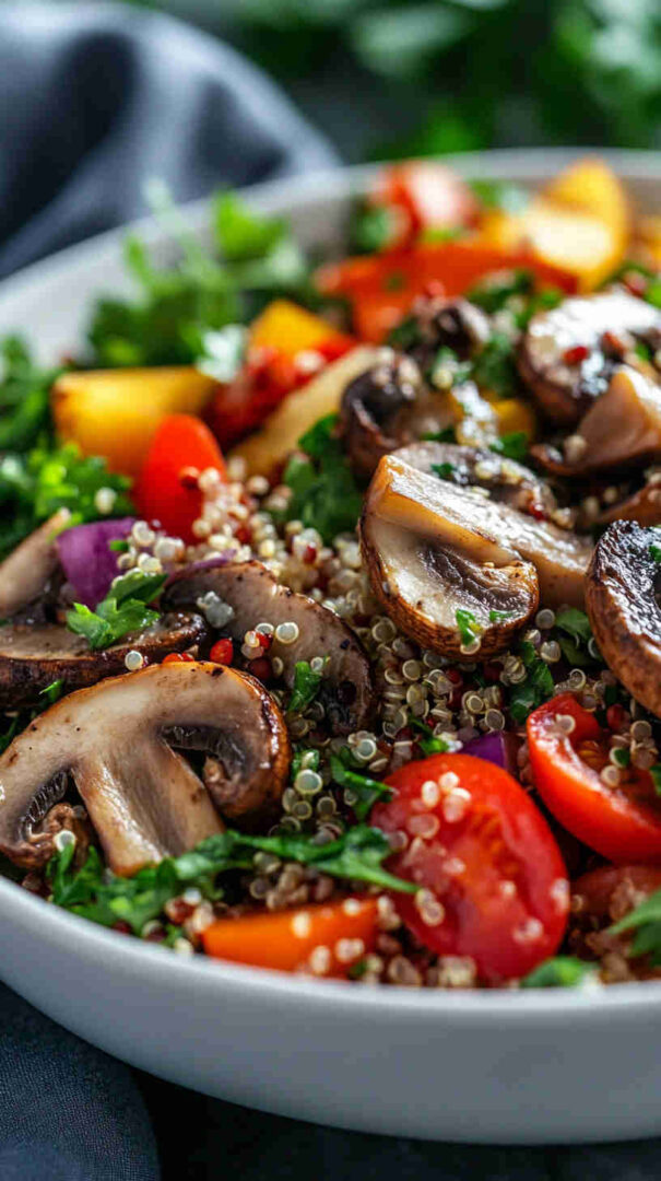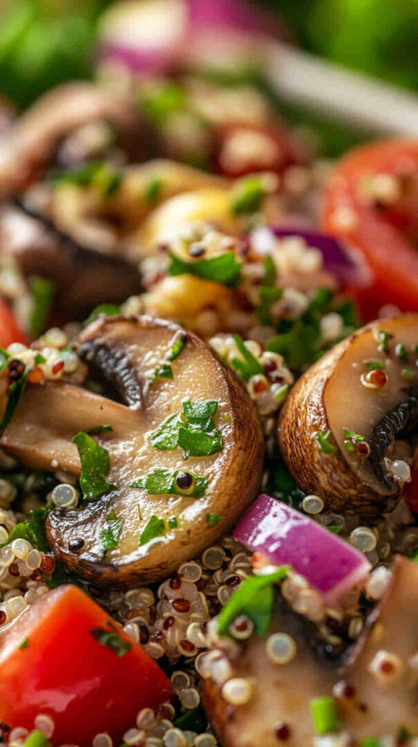 - Taste one last time—adjust salt, pepper, or a squeeze more lemon if desired. Transfer to a serving platter or individual bowls, sprinkle with hemp seeds or toasted pine nuts if using, and enjoy this fresh, protein-packed, earthy vegetarian mushroom quinoa salad at room temperature or chilled!