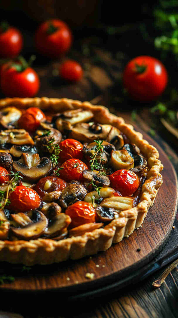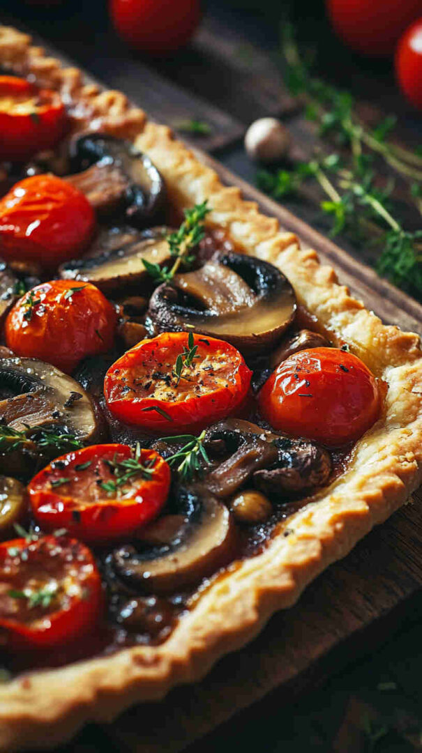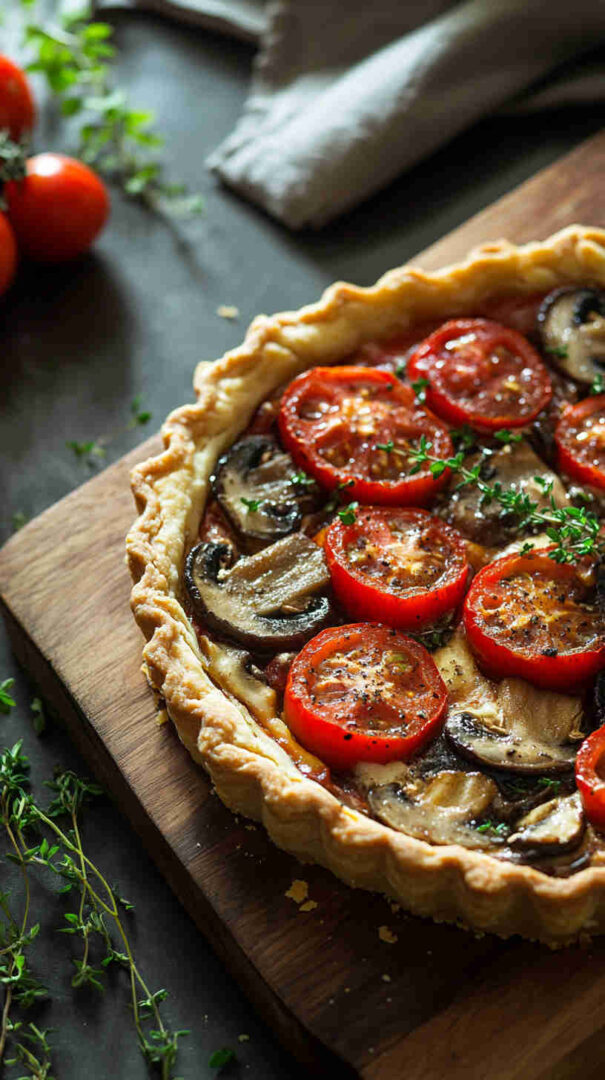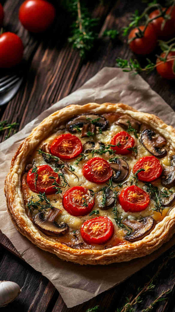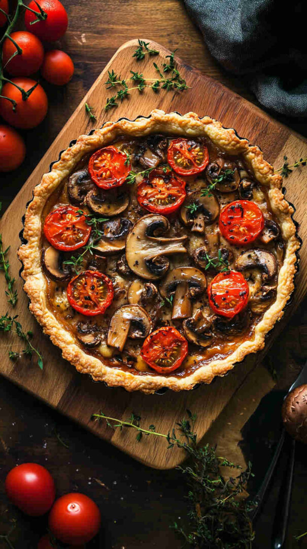 The Vegetarian Mushroom and Tomato Tart is a rustic, savory Italian-inspired masterpiece featuring a flaky pastry crust topped with garlicky sautéed mushrooms, juicy cherry tomatoes, caramelized onions, fresh herbs like thyme and basil, and a generous layer of creamy ricotta or goat cheese for richness.