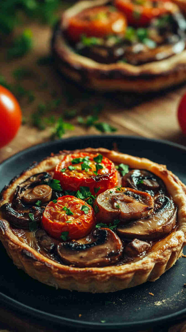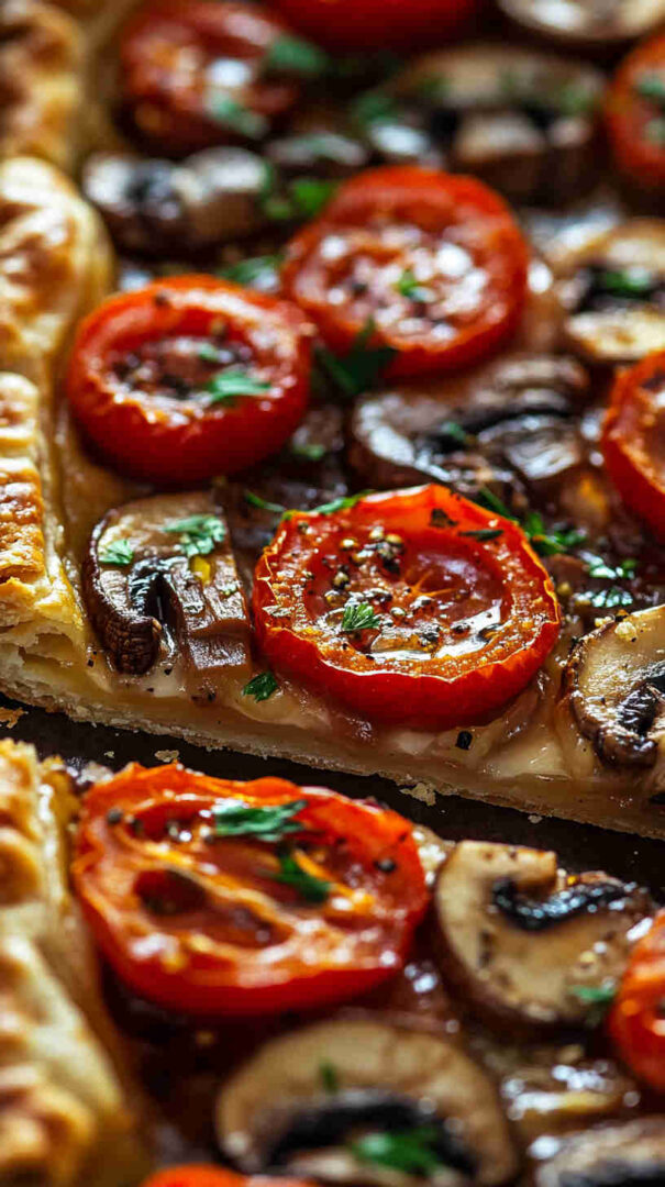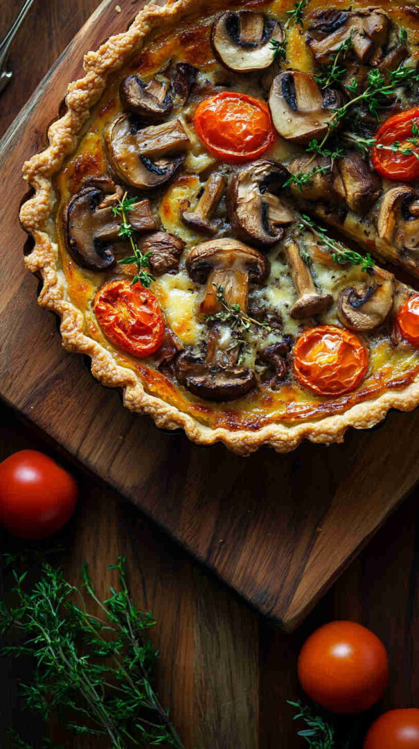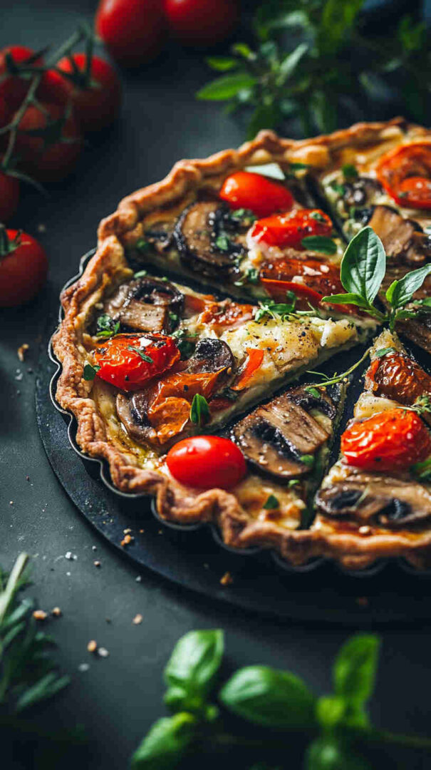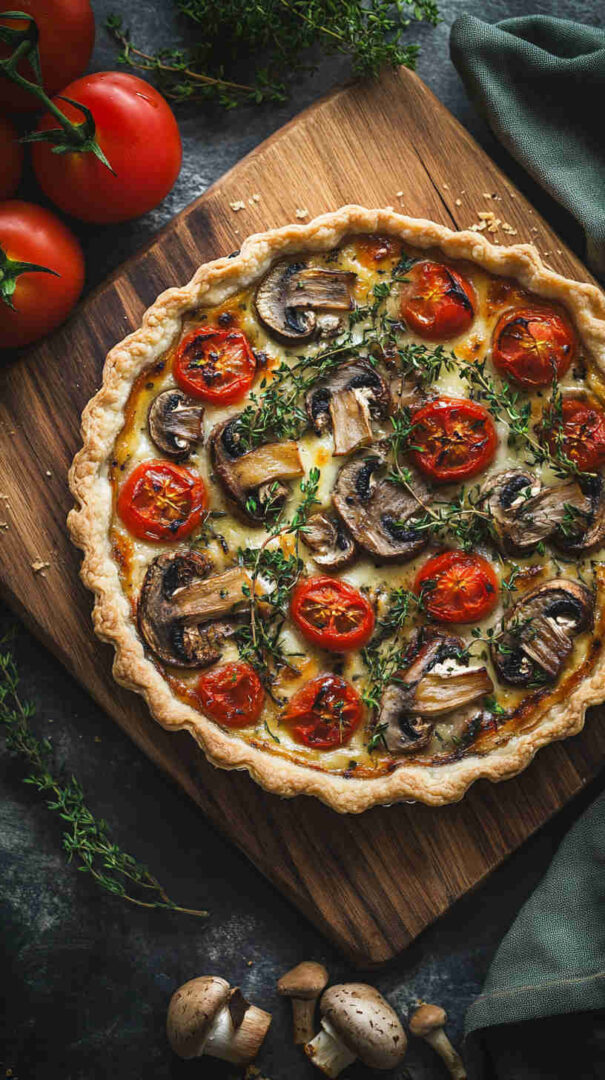 The Vegetarian Mushroom and Tomato Tart is a rustic, savory Italian-inspired masterpiece featuring a flaky pastry crust topped with garlicky sautéed mushrooms, juicy cherry tomatoes, caramelized onions, fresh herbs like thyme and basil, and a generous layer of creamy ricotta or goat cheese for richness.