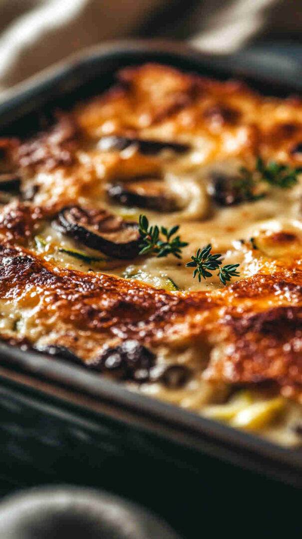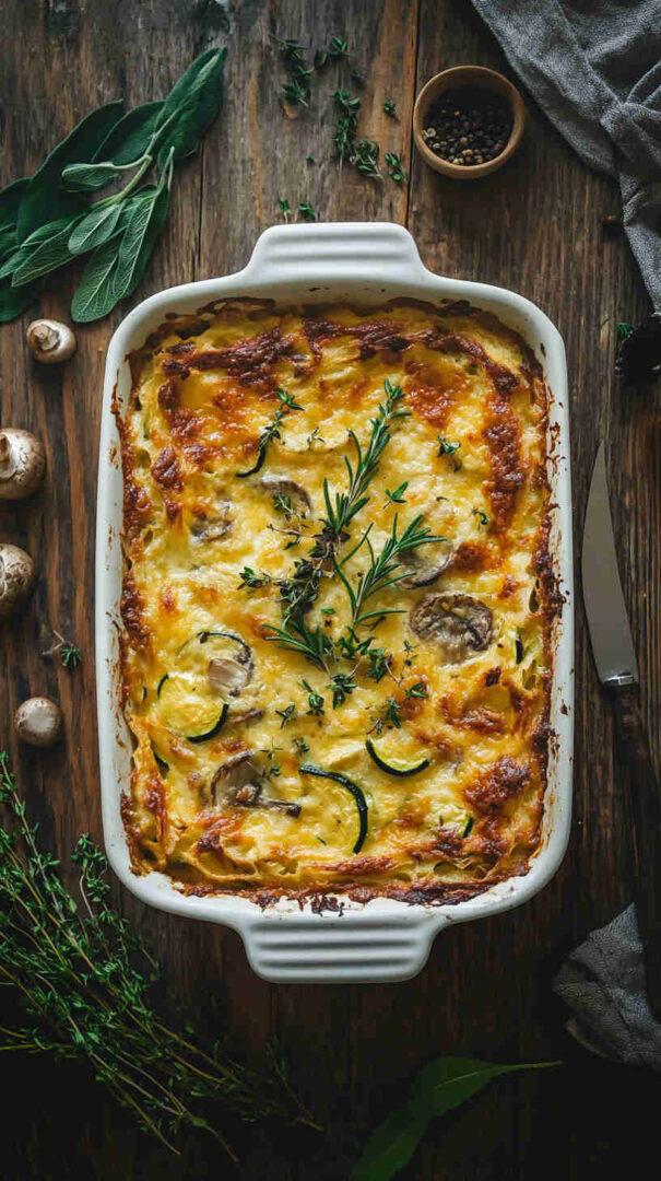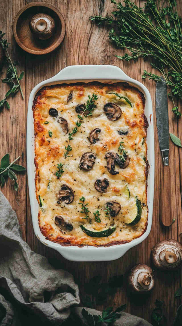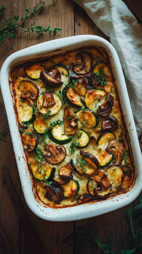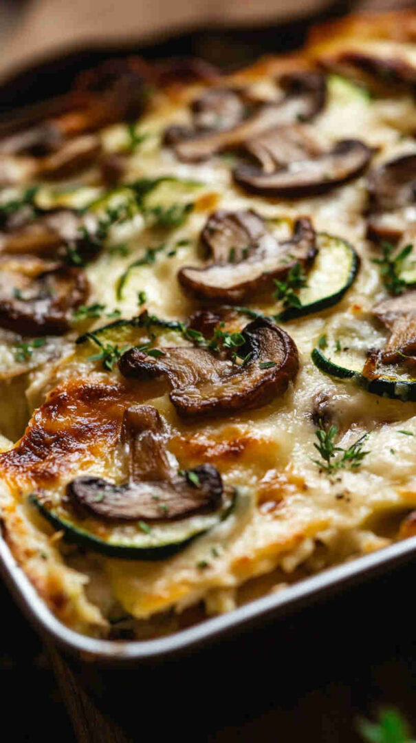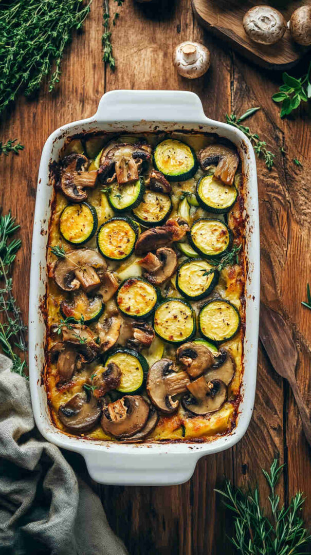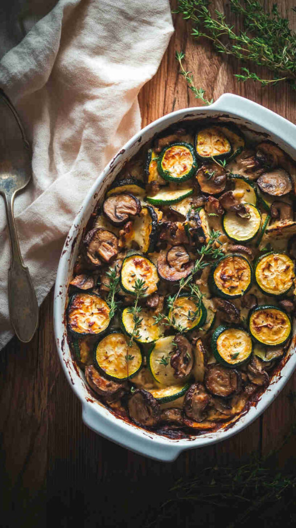 The Vegetarian Mushroom and Zucchini Casserole is a cozy, comforting Italian-inspired baked dish layered with tender sliced zucchini, earthy sautéed mushrooms, caramelized onions, garlic, fresh herbs like thyme and basil, and a creamy ricotta-Parmesan mixture or light tomato sauce base.