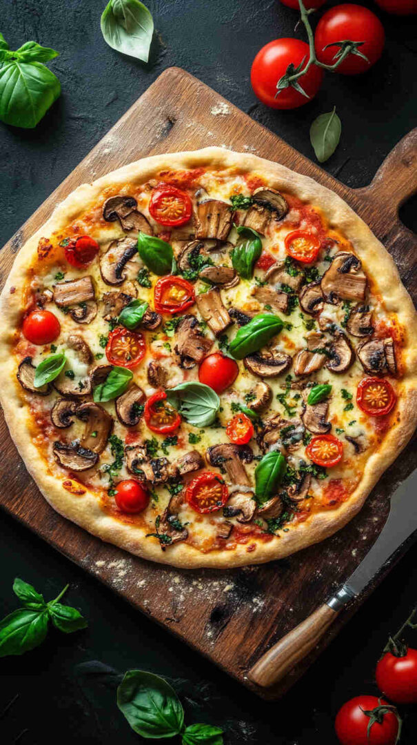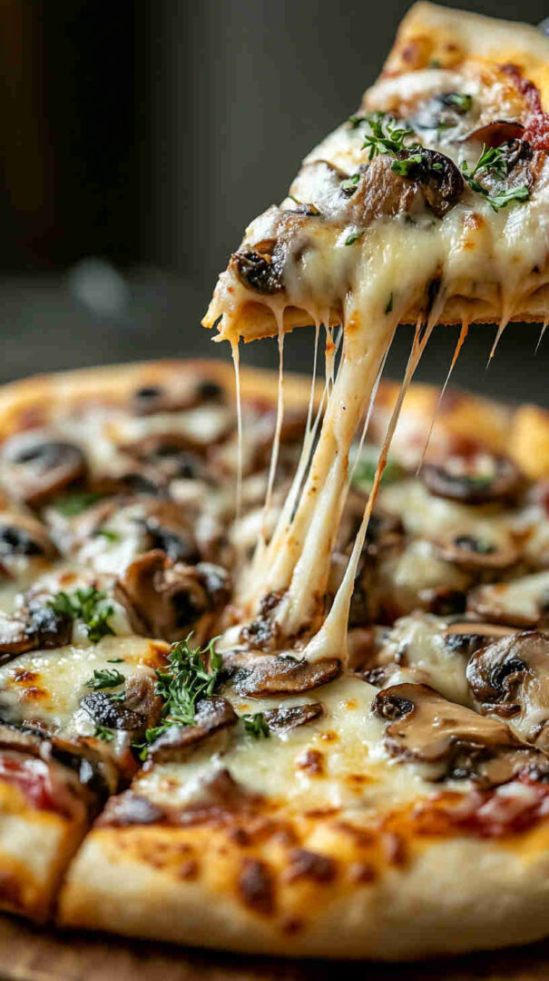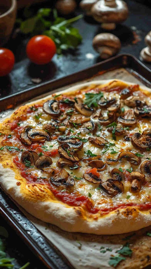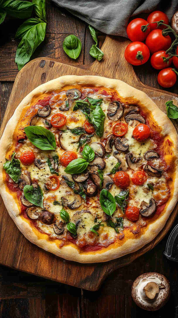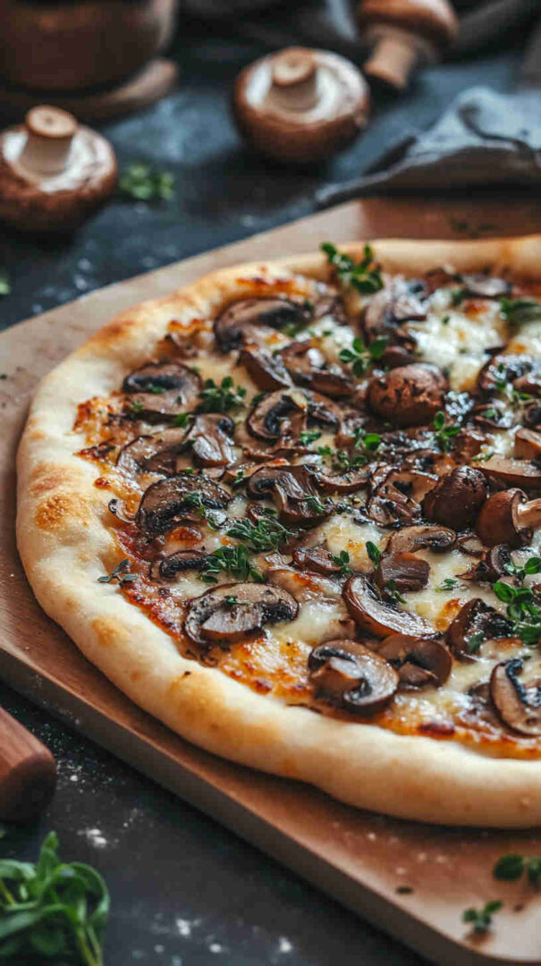 The Vegetarian Mushroom Pizza is a hearty, umami-packed Italian classic featuring a golden, crispy crust topped with garlicky sautéed mixed mushrooms (cremini, shiitake, portobello), caramelized onions, fresh mozzarella, rich tomato sauce, and fragrant herbs like oregano, thyme, and basil.