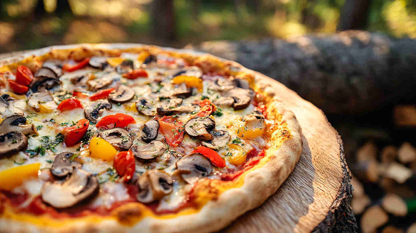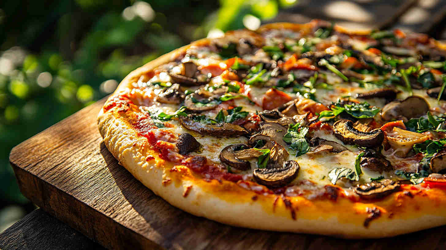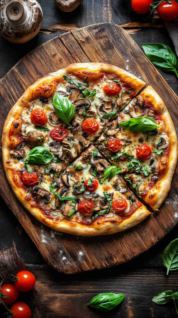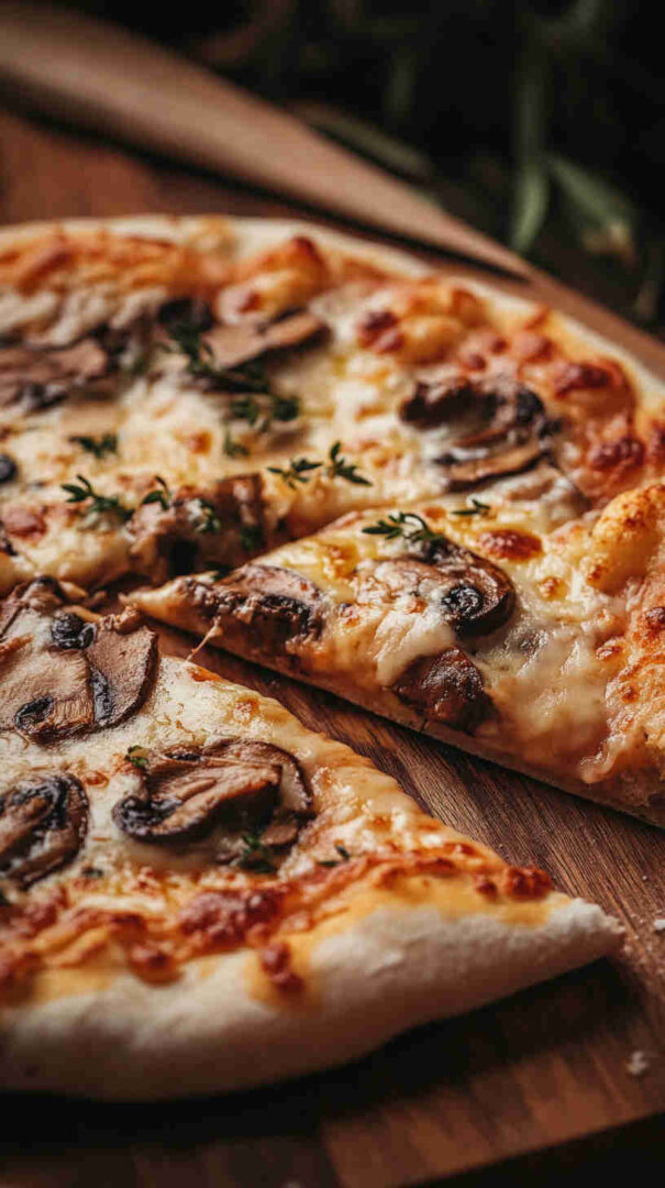 The Vegetarian Mushroom Pizza is a hearty, umami-packed Italian classic featuring a golden, crispy crust topped with garlicky sautéed mixed mushrooms (cremini, shiitake, portobello), caramelized onions, fresh mozzarella, rich tomato sauce, and fragrant herbs like oregano, thyme, and basil.