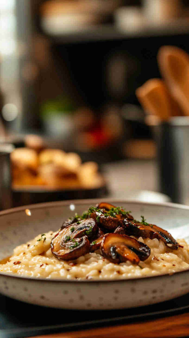The Vegetarian Mushroom Risotto is a creamy, comforting Italian classic made by slowly stirring Arborio rice with warm vegetable broth until velvety and tender.