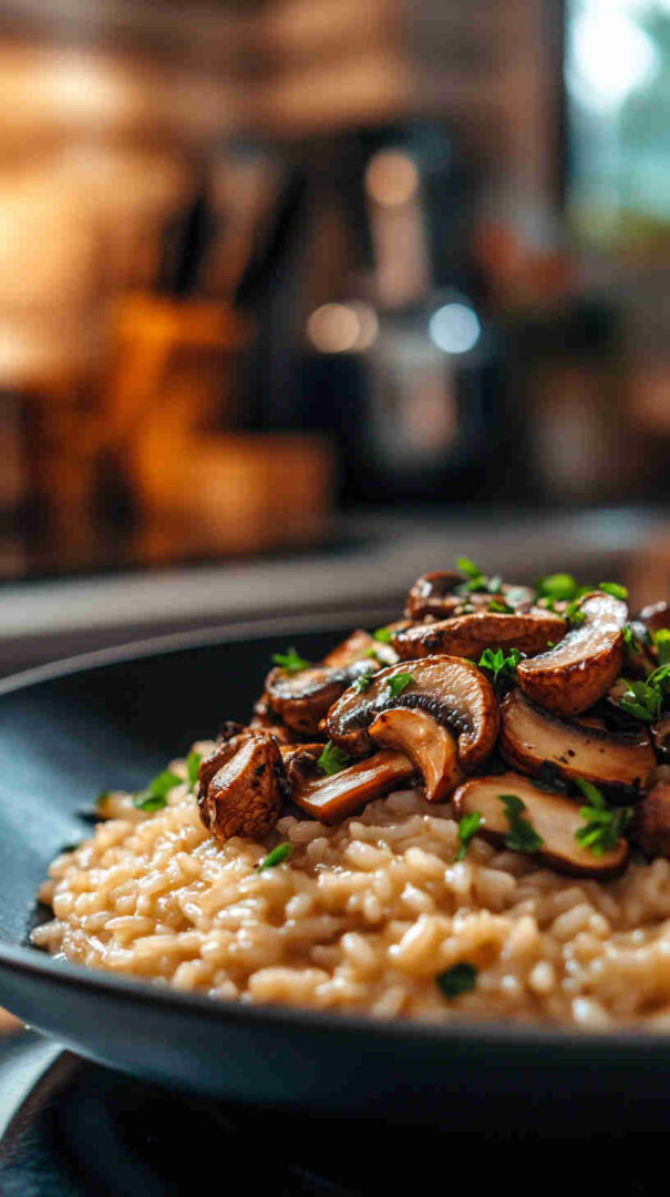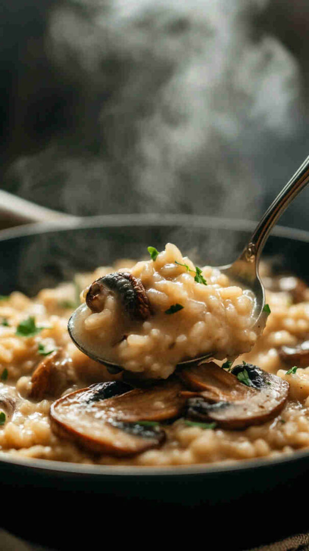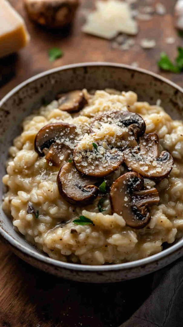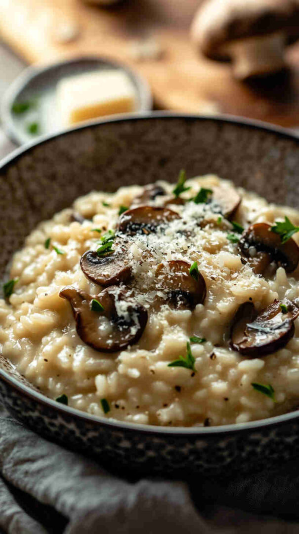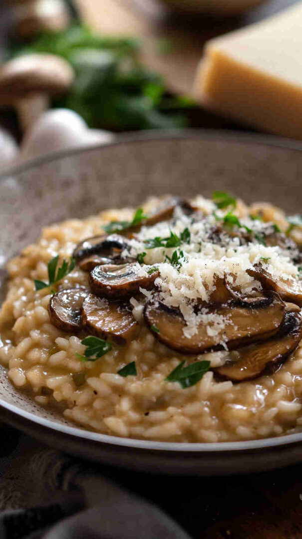 Creamy Arborio rice with garlicky mushrooms, Parmesan, and herbs—luxurious vegetarian Italian comfort!