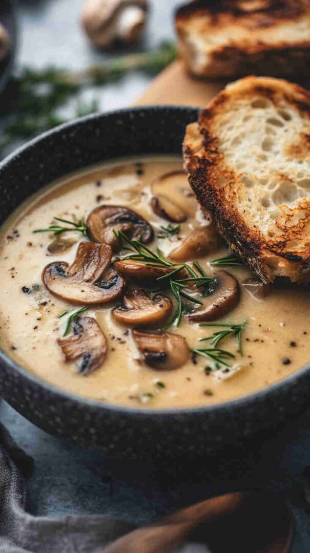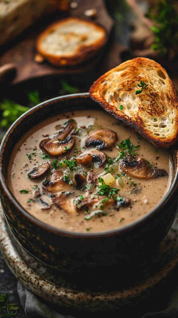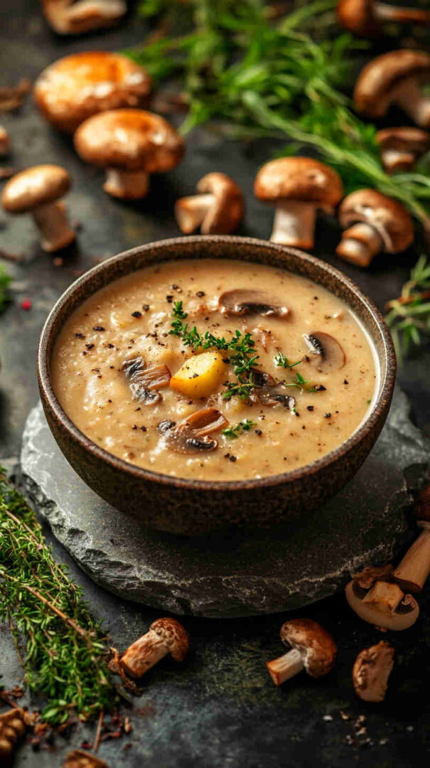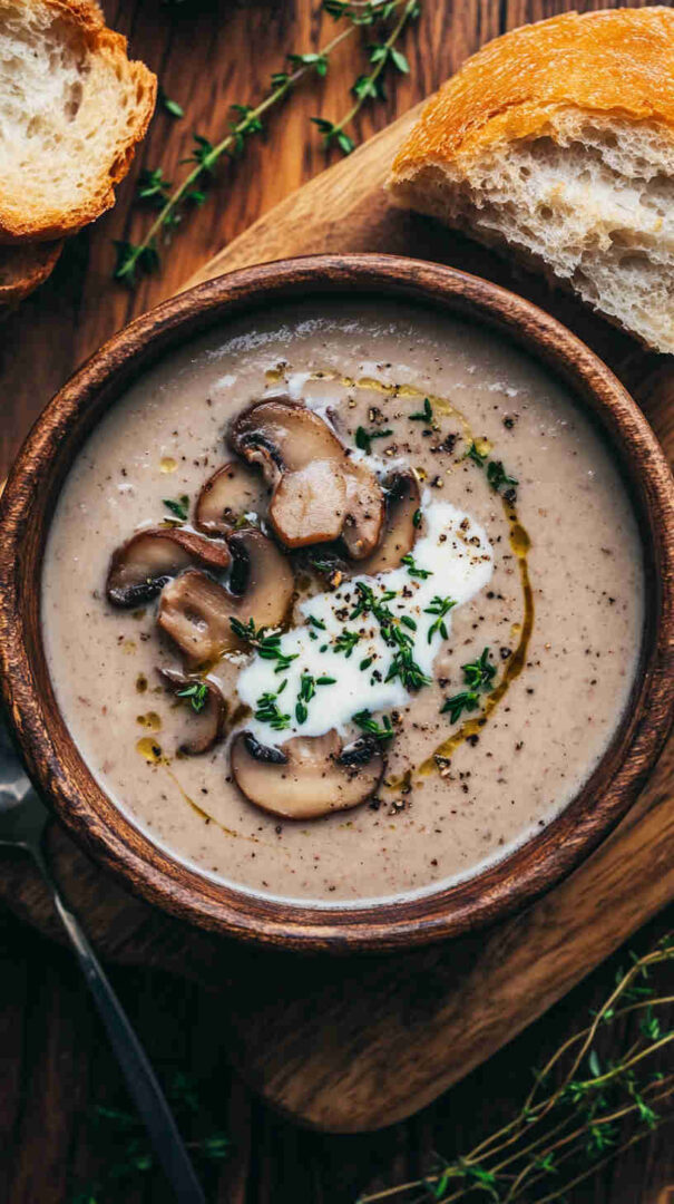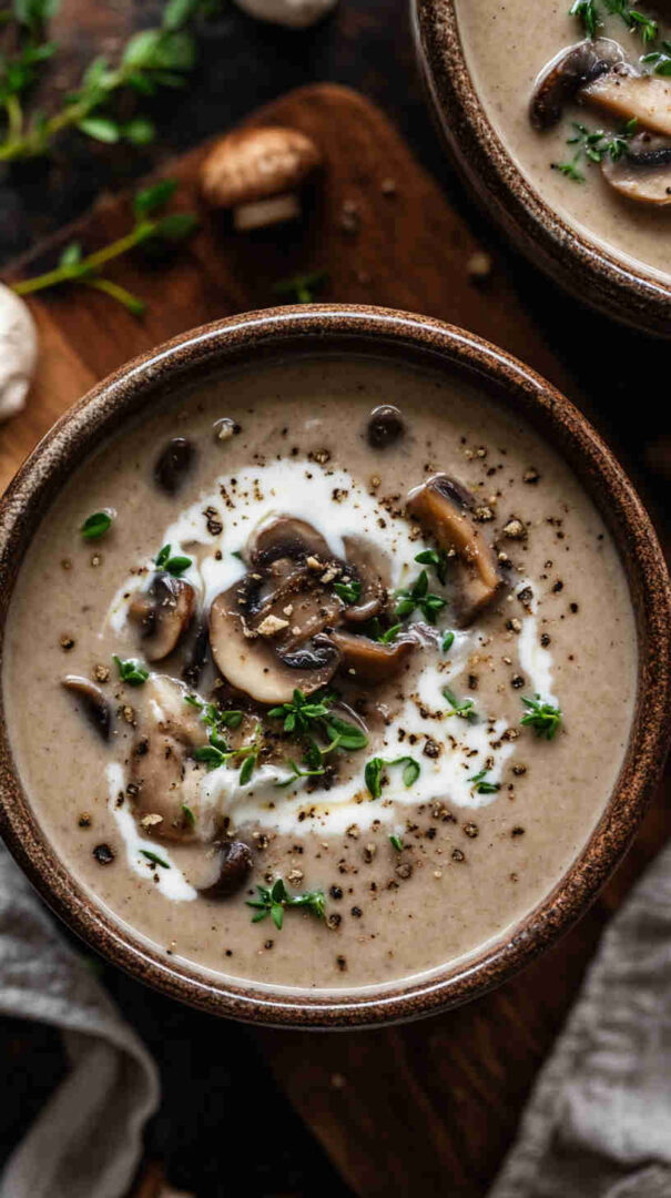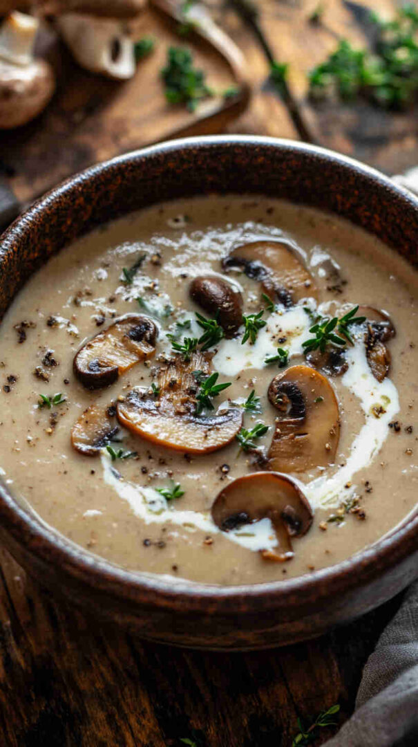 Velvety, earthy mushroom soup with garlic, thyme, and cream—cozy vegetarian comfort in a bowl!