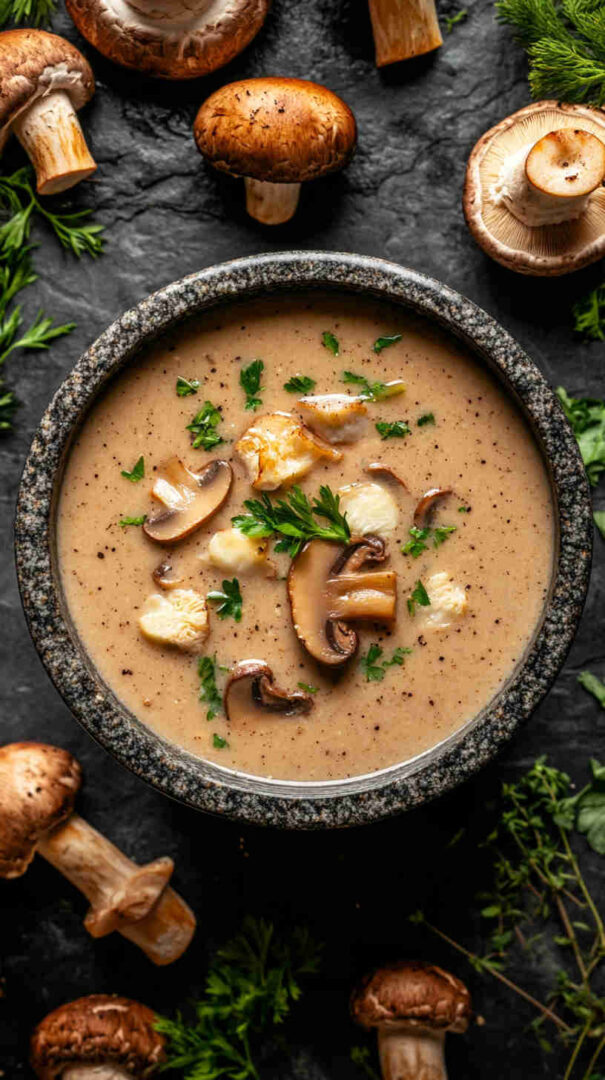 The Vegetarian Mushroom Soup is a velvety, soul-warming bowl of comfort featuring a medley of earthy mushrooms (cremini, shiitake, button) slowly cooked with garlic, onion, thyme, and a touch of white wine, then blended smooth with vegetable broth and a splash of cream (or plant-based alternative).