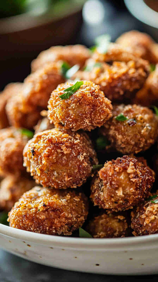 The Vegetarian Spicy Mushroom Bites are crispy, addictive little morsels made by coating meaty mushroom pieces (cremini, oyster, or portobello) in a seasoned chickpea flour batter, then frying or air-frying them until golden and crunchy.