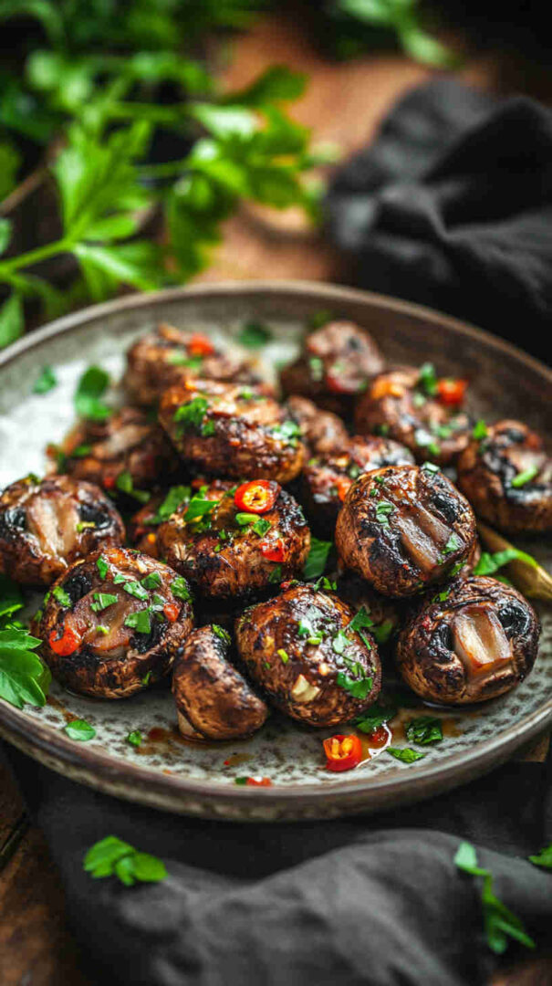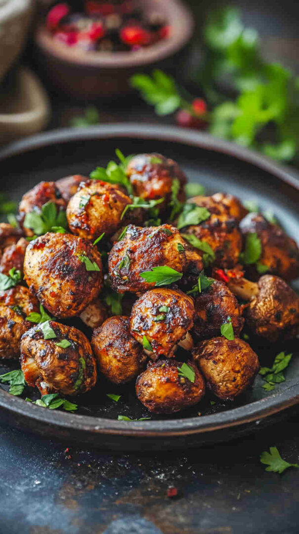 Tossed in a fiery, glossy sauce of garlic, ginger, soy, chili, and a touch of sweetness, these bold, spicy bites deliver crunchy texture, juicy mushroom centers, and irresistible heat—perfect as a party appetizer, game-day snack, or spicy vegetarian side.