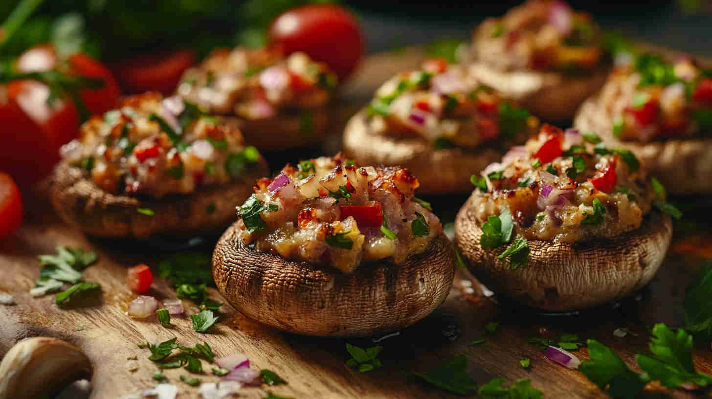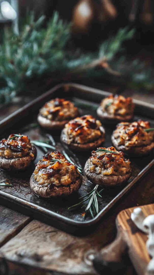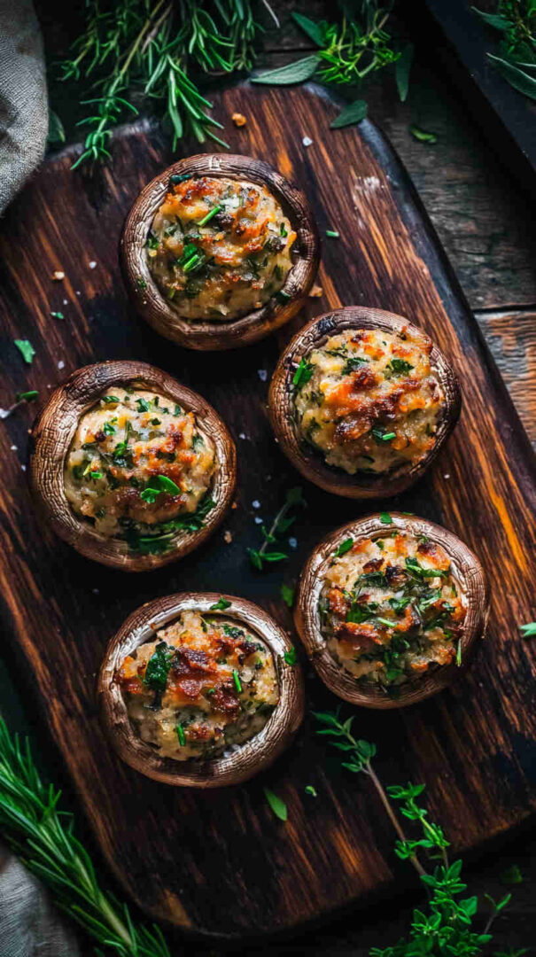 The Vegetarian Stuffed Mushrooms are elegant, bite-sized appetizers featuring large cremini or portobello mushroom caps generously filled with a savory mixture of breadcrumbs, sautéed garlic, onion, spinach, sun-dried tomatoes, fresh herbs, and a blend of Parmesan and mozzarella cheeses.
