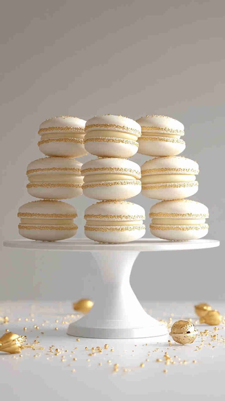 Delicate almond macaron shells sandwich velvety white chocolate ganache infused with vanilla bean and a hint of almond. Sprinkled with edible pearls, these elegant treats capture classic wedding cake flavor—sophisticated bridal shower delights ready in stages.
