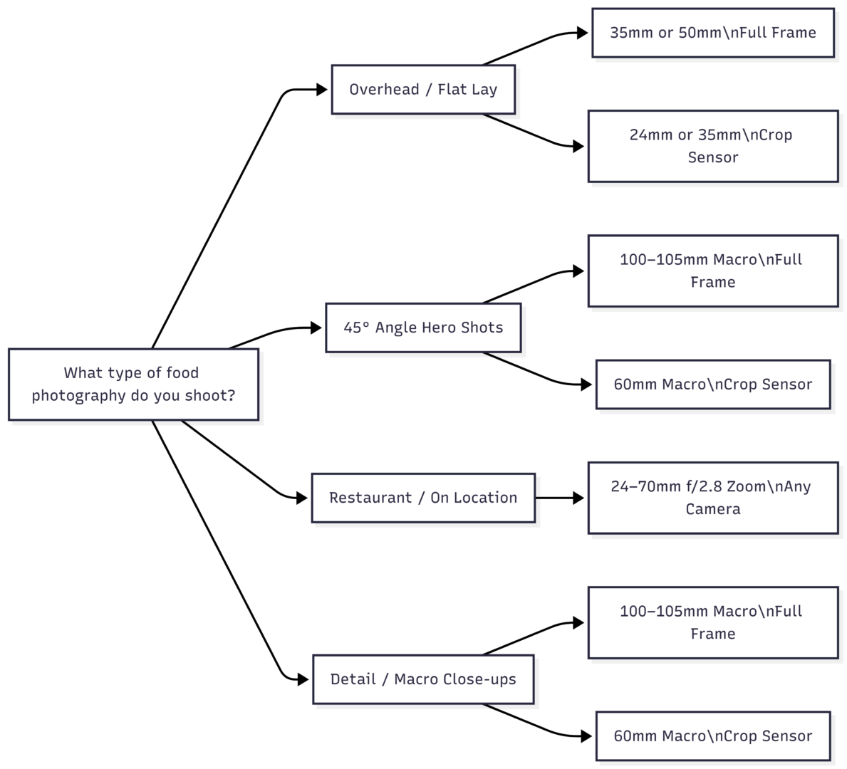 If you shoot mostly hero dishes at 45 degrees on full frame: The 100mm or 105mm macro is your lens. It’s the most-used focal length among professional food photographers for a reason.