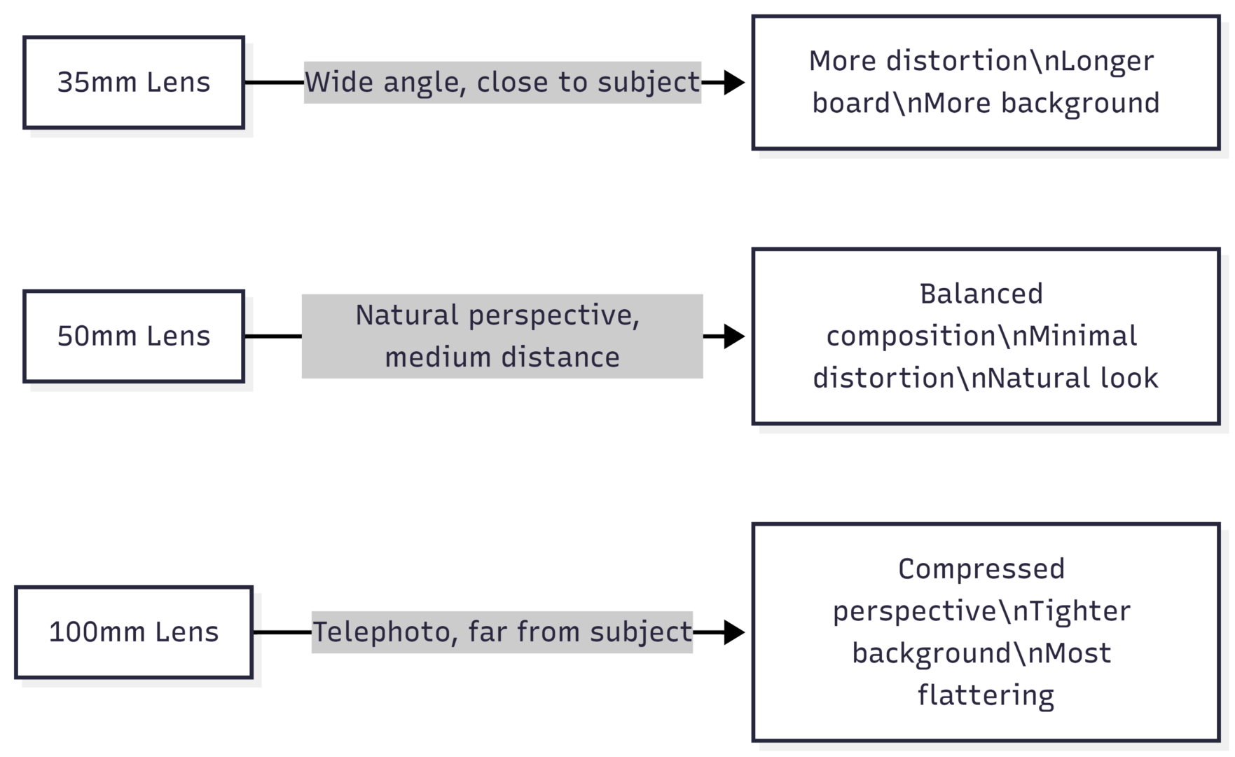 - A longer focal length (e.g., 85mm, 100mm) gives a narrower view, magnifying the subject, compressing background elements closer together, and producing a more flattering, “stacked” look.