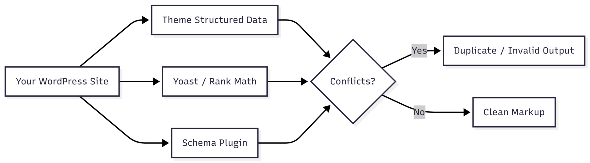 WordPress sites face additional complexity because structured data often comes from multiple sources simultaneously: the theme, SEO plugins, and schema-specific plugins. Conflicting or duplicate markup confuses Google’s parser and can cause all markup to be ignored.