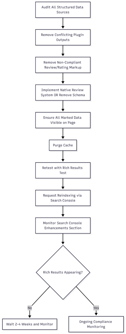 The fastest path to resolution is to audit what’s actually in your page source, remove any review or rating markup that doesn’t reflect native user-generated content on your own platform, ensure a single plugin controls your schema output, and verify every marked-up property is visible in the page content. After fixing violations, request recrawling through Search Console and monitor the Enhancements section over the following weeks.